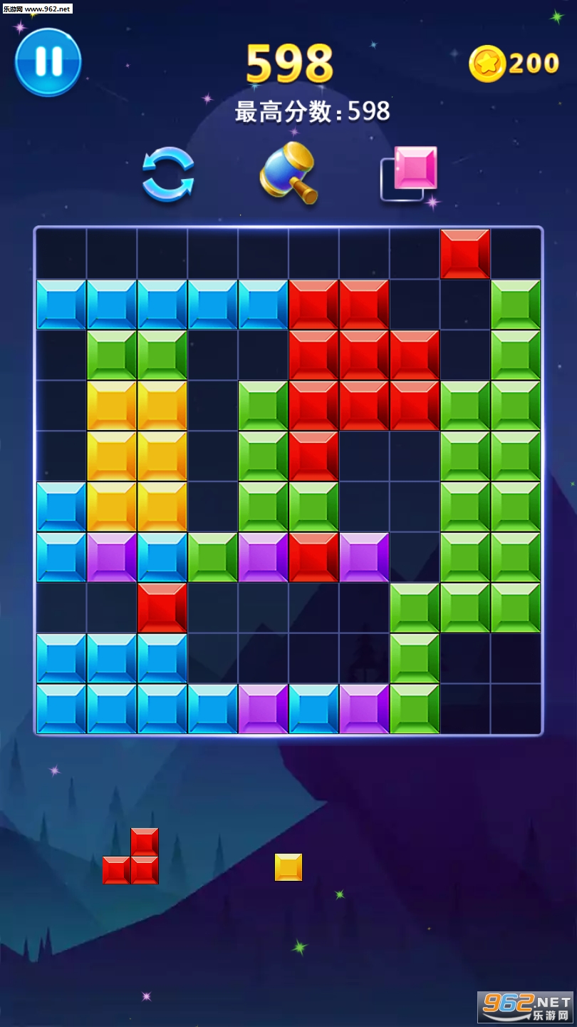 1、拖动模式:将屏幕下方的三个备选方块拖入1010方块宫格中,一行或一列铺满即可消除。
