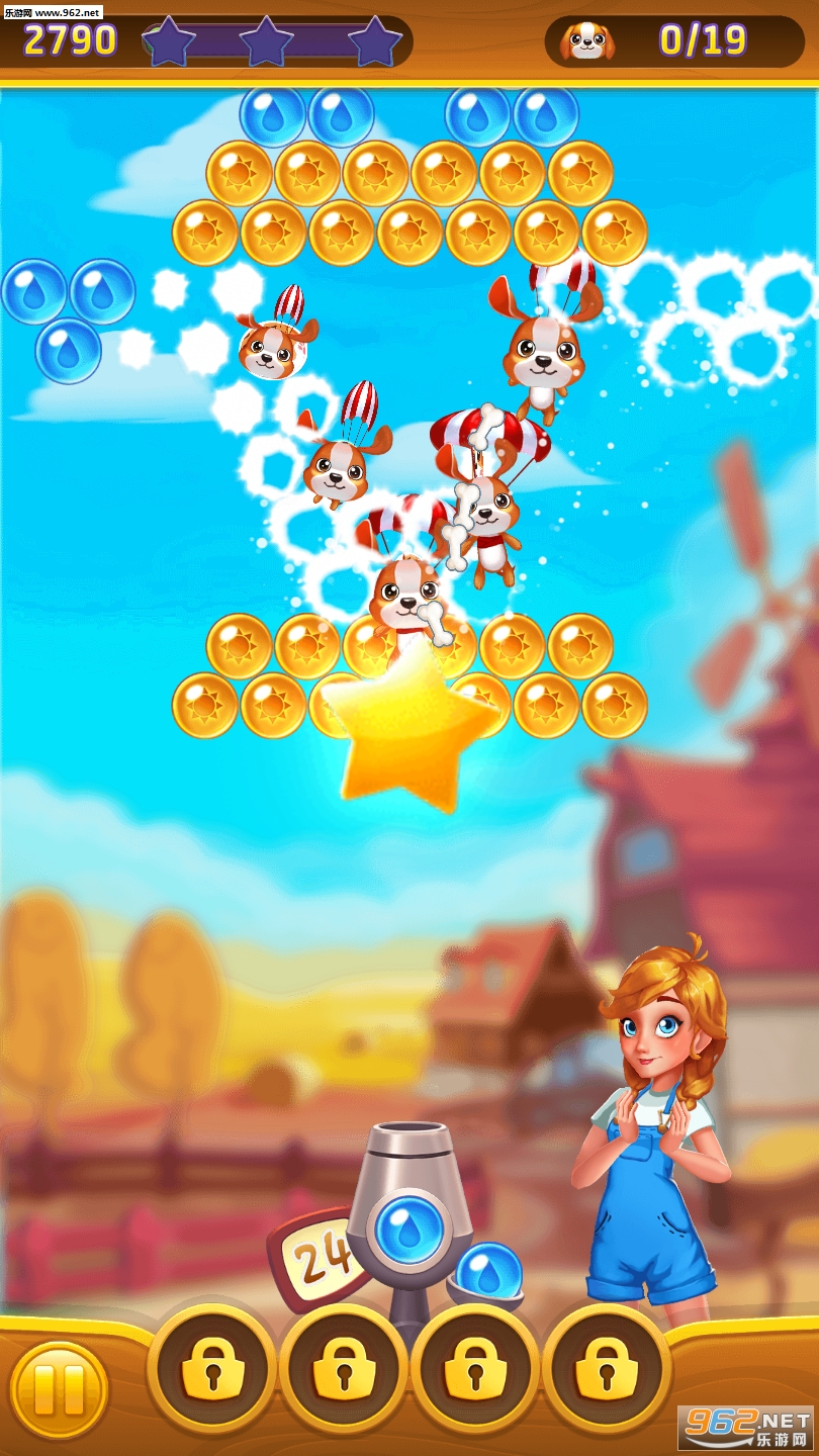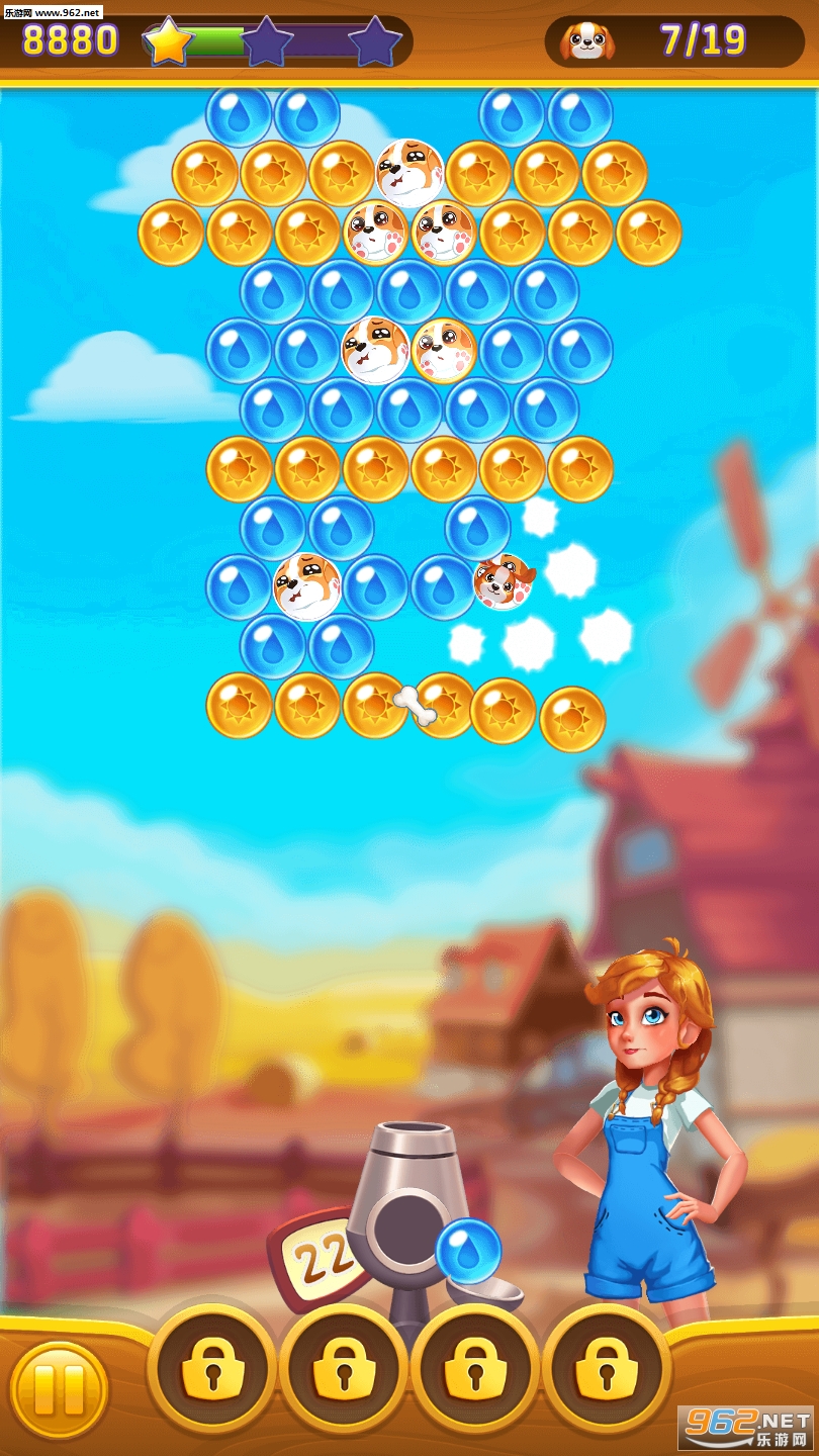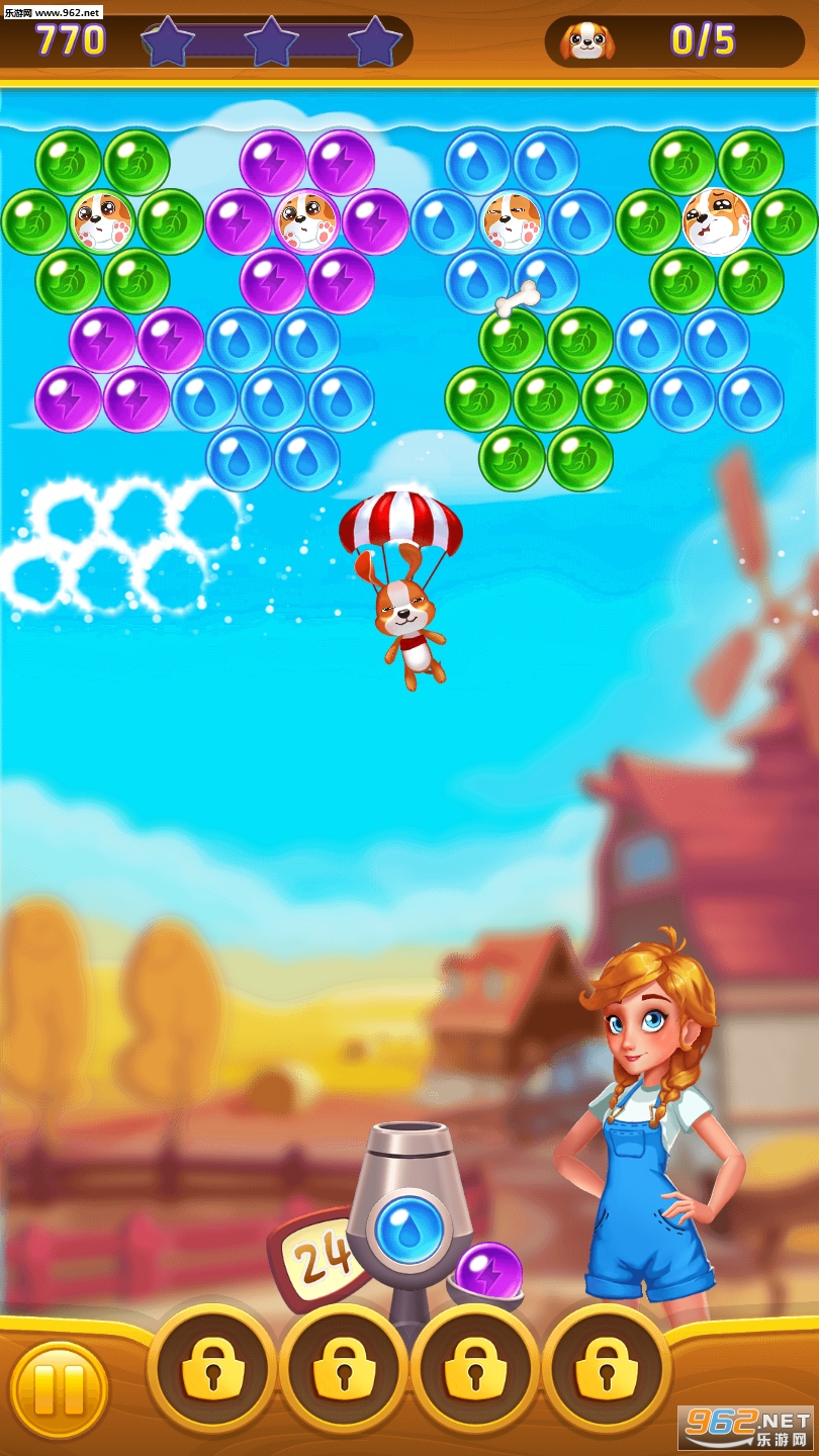 2、像中间射向炮弹,你将会消除大片的泡泡,而且还会营救更多的小狗狗;