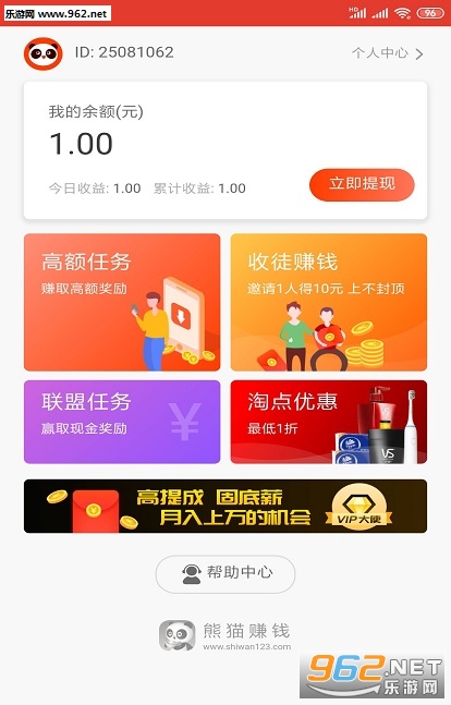 1.点击上方立即下载,注册熊猫赚钱!