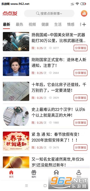 是一款非常给力的转发类手机赚钱软件,文章干净适合分享、福利多多红包拿不停。点点发app下载安装后新用户注册登录就会送2元现金红包,完成新手任务还有2元现金红包,新手答题赢礼包再送1元,转发单价0.25元/次阅读,每日分享文章达到条件还可以参与抢红包,同时还支持添加文章,审核通过后每篇文章奖励1元自动计入账户。