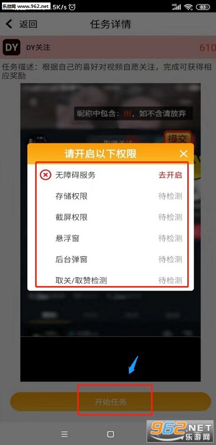 新用户登录点击“首页”选择快手和抖音点赞关注赚钱任务,进入任务点“开始任务”按照提示把权限打开