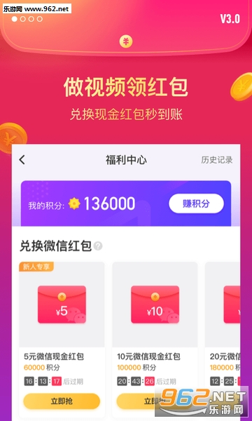 做视频领红包,只要你的积分达到一定额度就能兑换5、10、20不等的红包;
