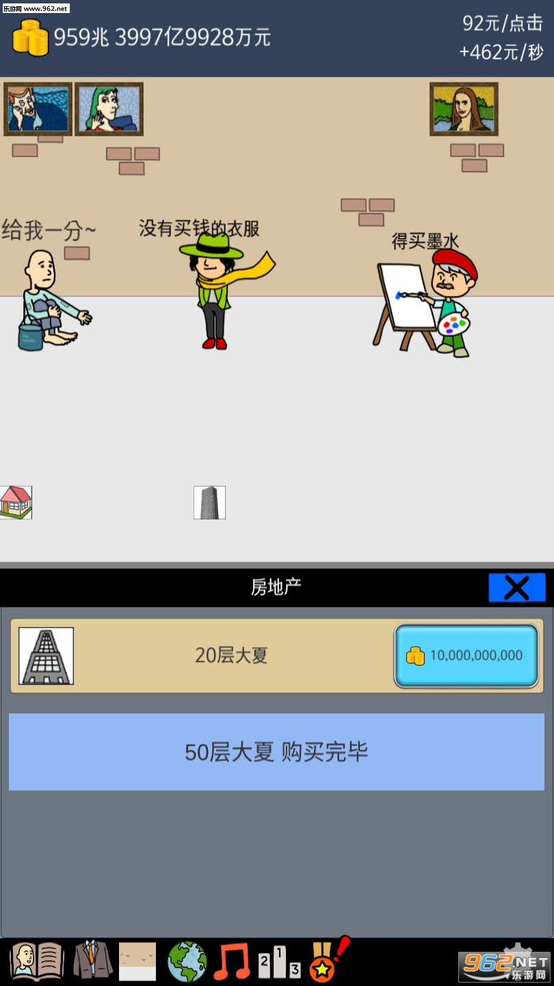 3、雇佣街头艺术家们,用财富实现他们的艺术梦想,解锁专属沙雕剧情。