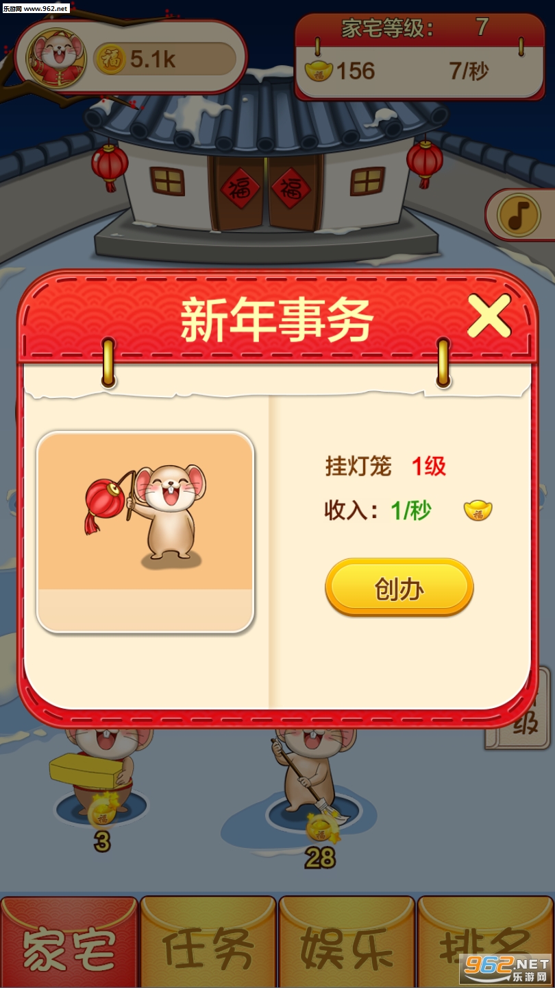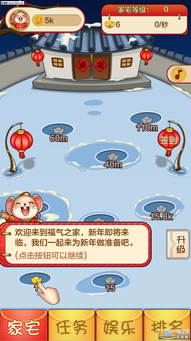 福气之家红包版是一款非常有趣的休闲益智类的放置游戏。全部使用喜庆的大红色,并给所有的人物都穿上了红衣服。里外都透露出一股过节的气息,说的过节当然就少不了红包了。在这里你能够通过各种类型的任务来赚取元宝,使用元宝能够兑换随机大红包。