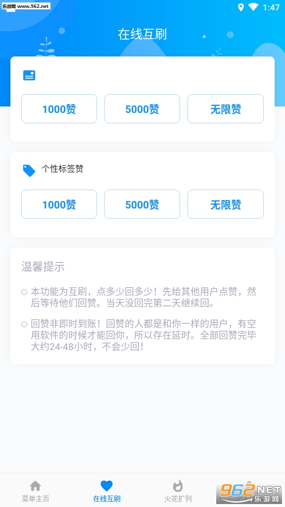 爱上挂机互赞是一款互赞工具,它操作简单,功能多样齐全,支持批量回赞、个性标签赞、说说浏览、说说赞、空间访客、好友批量点赞等功能,还可以扣扣音乐30分钟加速0.5天,签到领取1w名片赞,非常适合用于扣扣等社交App,高效实用。快来爱上挂机互赞App体验吧!