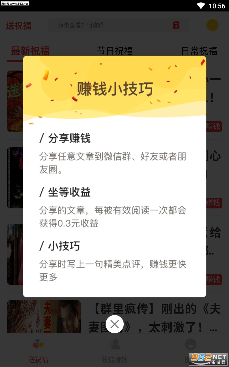 《送祝福分享赚钱平台》是一款非常不错的阅读分享赚钱的软件平台,平台中有丰富的赚钱任务可以领取,做起来的要求不高门槛相对较低,是很简单的赚钱软件,可以获得非常不错的收益哦,感兴趣的亲们赶紧下载吧。
