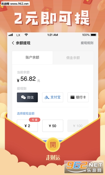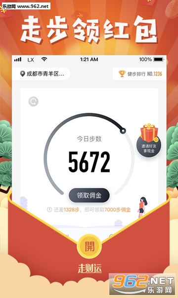 走财运是一款走步赚钱领红包、步数赚钱领红包、走路赚钱领红包、步数换钱和红包的应用。让你走路就能赚钱领红包,每1000步领取1次节能环保佣金,轻松领到红包赚到钱,并且2元钱即可提现。