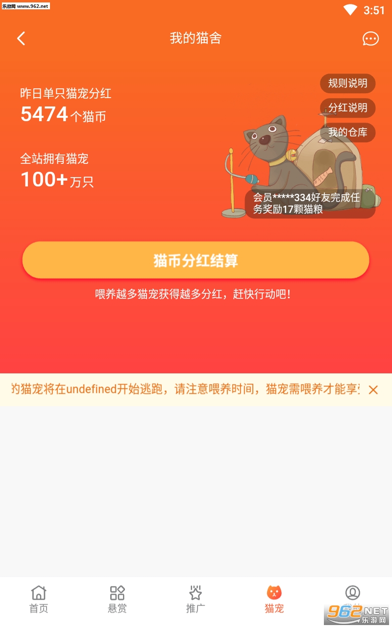 每完成一个任务奖励1只猫宠,猫宠可分红