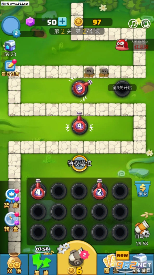 2、boss出现会有提示,根据地图情况,不断升级塔防火力。