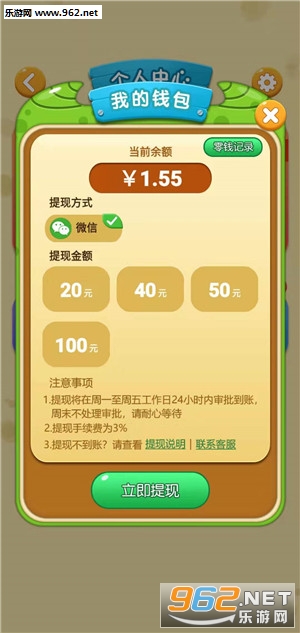3、满20元提现到钱包,周一至周五工作日24小时内到账
