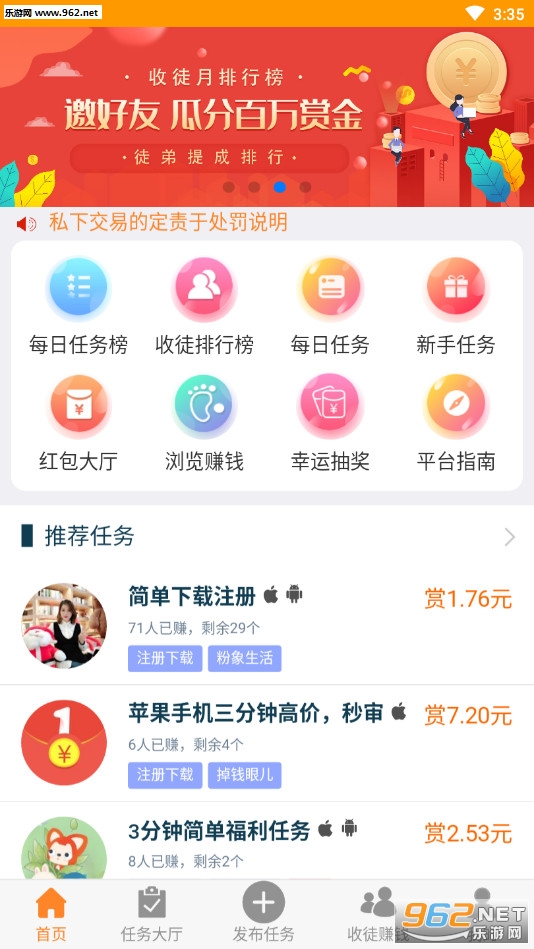 众乐帮-悬赏、互助、做任务类手机赚钱软件,和众人帮比较相似,每天都有大量的悬赏任务可以做。众乐帮app下载安装后完成新手任务即可获得5.5元的额外现金奖励,还有每日任务完成一定数量的悬赏任务,最高能获得8.7元的额外奖励,还有每日接单排行榜,如果上榜的话同样会有额外的奖金,可以说是福利多多,赚钱多多。