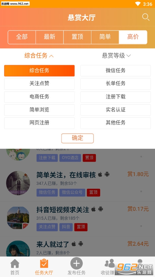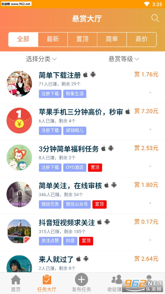 众乐帮做悬赏任务赚钱软件拥有海量的悬赏任务,任务类型主要分为任务、关注点赞、长单任务、电商任务、注册下载、简单浏览、实名认证、网页注册等等,还可分为最新、置顶、简单、高价,任务单价也是从0.1-100元都有,甚至还有更高单价的任务,只要你每天用心去做,那么就能获得丰厚的现金奖励,而且商家也可以发布悬赏的任务,寻找更多网友来帮你完成任务。