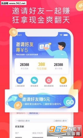 邀请好友一起赚钱,邀请好友就可以直接获得5元钱,并且还能获得好友收益提成奖励;