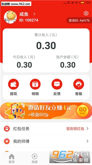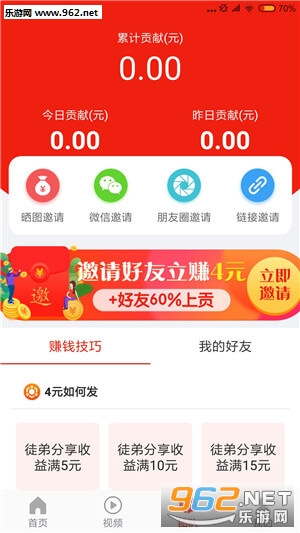 邀请好友立赚4元,并且可以获得一级徒弟40%+二级徒弟20%的收益分成。