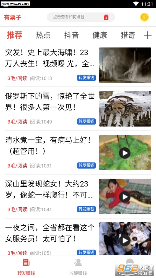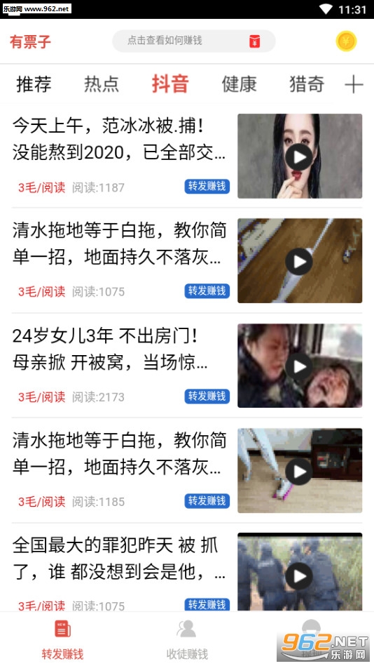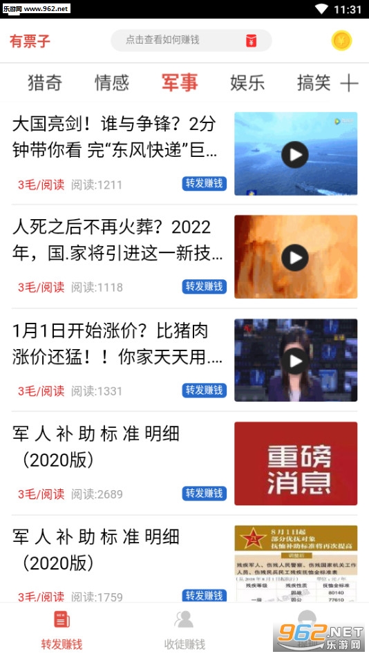 《有票子》是一款非常靠谱的文章转发赚钱平台,提供各种各样优质的文章,用户可以自由的选择转发来获得佣金奖励,软件中还有着丰富的福利和奖励等待你的领取,提现门槛低。快速到账,在手机上就能赚钱,赶快下载体验吧!