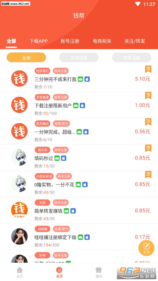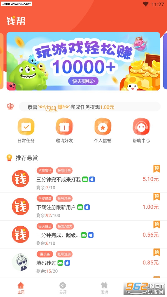 钱帮app,做悬赏、来钱帮,海量悬赏任务等你来玩,每天几分钟,轻松赚现金。邀好友、享提成,躺着也能有收益,快来叫上亲朋好友一起来玩吧!