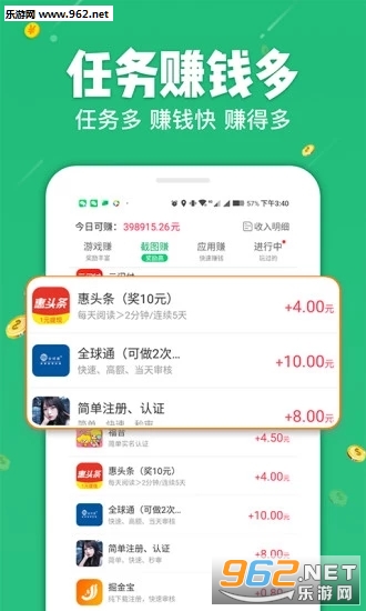 《人人赚钱宝app》是一款全新上线的手机做任务赚钱平台,软件为用户提供了海量任务,只需要按照平台的要求完成即可获得奖励,0门槛0投资,所有人都可以参与进来,喜欢这类手赚软件的老哥快来962下载体验吧!