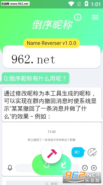 《倒序昵称app》是一款功能比较强大的特殊昵称生成工具,操作起来比较方便,大家可以直接利用此工具,为自己的生成一个非常有特色的昵称,在朋友圈和群聊天中显得更加的特别,还有一些其他的效果可以让你体验哦!