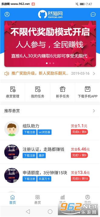 然猫是一款通过做一些悬赏任务来赚取佣金的奖励平台,一个做任务的手机赚钱软件,在全新的网赚模式下推陈出新,不一样的格局和眼界绝对你未来的收入。然猫网平台每天都有海量的任务上架,用户注册后可以选择自己感兴趣的接单,赚取佣金和分红,还可以在线推广赚钱,将平台任务分享给他人,对方加入后你也有佣金奖励哦,随时随地想赚就赚!