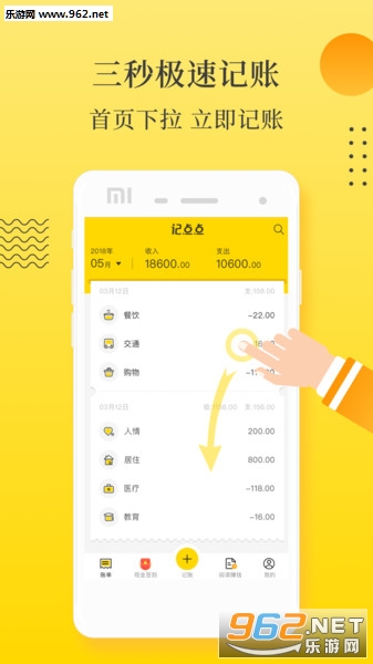 1、下拉记账:智能手势操作,首页下拉即可快速完成记账。