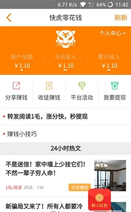 快虎app是小编整理出来的一款超级棒的网赚赚钱软件,用户在这里通过转发文章即可赚钱哦,全新模式轻松网赚,让用户您不管什么时候都可以赚钱哦,感兴趣的用户赶快来下载吧!