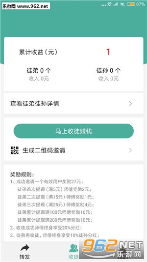 成功邀请一个有效用户奖励27元,收徒成功师傅终身享受20%分红,徒弟再收徒,师傅终身享受10%徒孙分红。