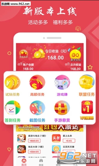 赚宝APP里面分别试玩任务和高额任务,首次下载可领取【新手红包】,完成新人红包可领取最高10元的红包。试玩任务和高额任务获得0.2-1.5元任务奖励,完成试玩和高额任务还可解锁签到任务和截图任务的额外奖励。