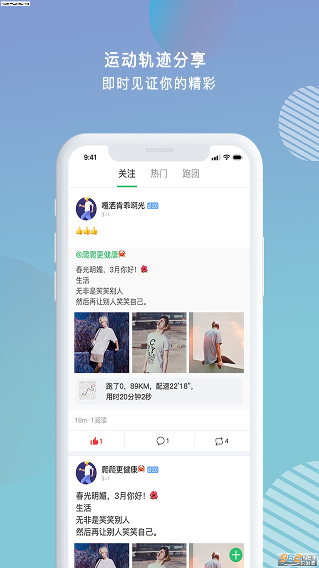 跑步结束后,可以查看运动轨迹和统计数据等,并可直接分享到动态或朋友圈。