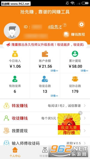 邀请好友可获得15~20元奖金+50%两级下线提成,徒弟越多,收入越高。