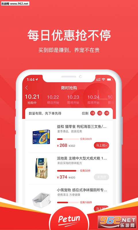 1、限时抢购:可以抢购各种优惠宠物商品;