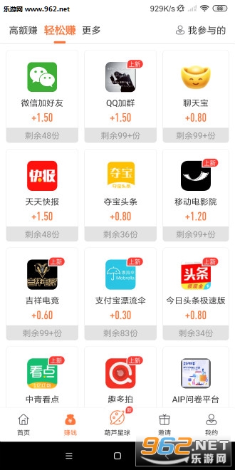 葫芦星球注册送1元,有轻松赚、高额赚、小程序试玩等多种任务模式,轻松赚主打应用试玩,单价0.2-10元;高额赚包括棋牌、手游、捕鱼、应用等几类任务;小程序试玩奖励稍低,但是很容易,奖励自动到帐。
