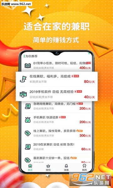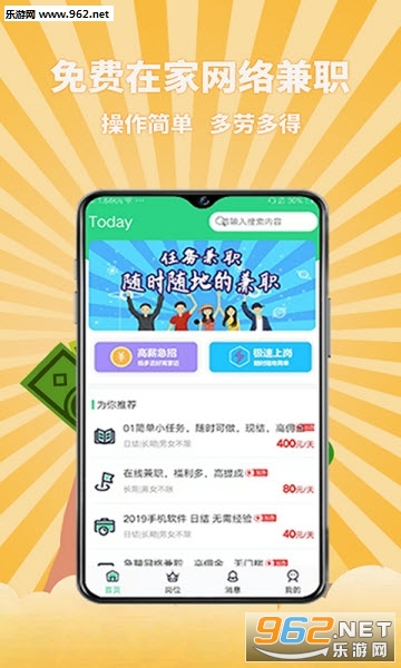 《宅家兼职app》是一款非常好用的宅在家里就能赚钱的软件,软件内的所有兼职任务都是合法正规的,提供的岗位都非常人性化,用户完成平台中的任务之后就能获取丰厚的奖励,轻轻松松找到你喜欢的兼职赚到零花钱。有需求的话就快来下载吧!