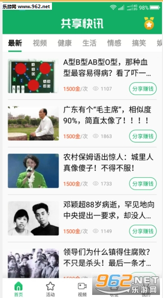 1、首页,文章单价是1500金币一次,也就是0.15元的意思,点击文章分享到,有点击就有收益哦!