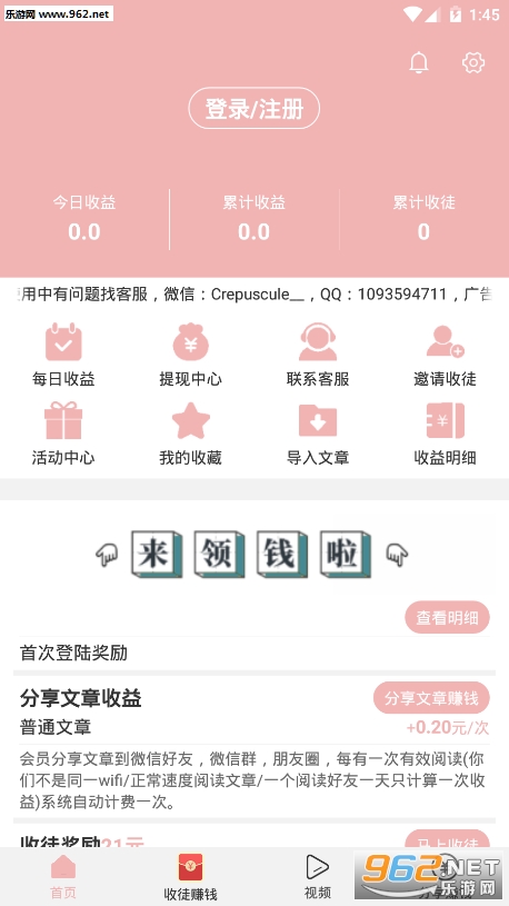 1.注册送1元红包,转发文章后有三次收入就能提现。