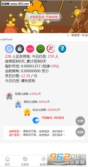 《随时挖》是一个专业靠谱的挖矿平台,依托高端的区块链技术,让每个用户都能快速稳定地赚钱。现在完成注册,上线立即赠送一套初始矿机,直接零撸起手,就是这么给劲!感兴趣的朋友欢迎来962下载体验!
