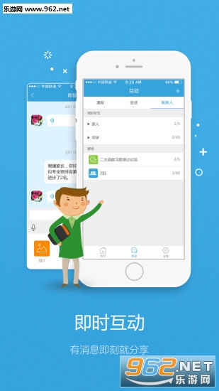 1、互动:获取学校最新动态资讯、考试成绩,实现学生、老师、家长的全方位即时沟通;
