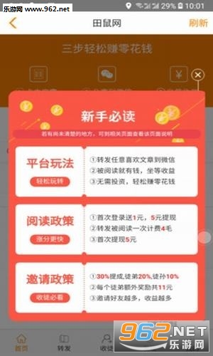《田鼠网零花钱》是一款转发赚钱的软件,朋友们进入田鼠网app之后领取任务,然后去阅读文章,转发文章,去朋友圈等地方赚取阅读量,可以利用阅读量来兑换红包等奖励,每天赚一点零花钱。
