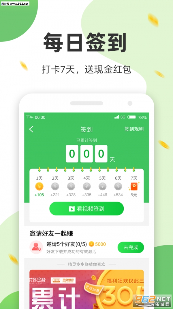 完成每日签到领金币,连续签到打卡七天,就送现金红包奖励;