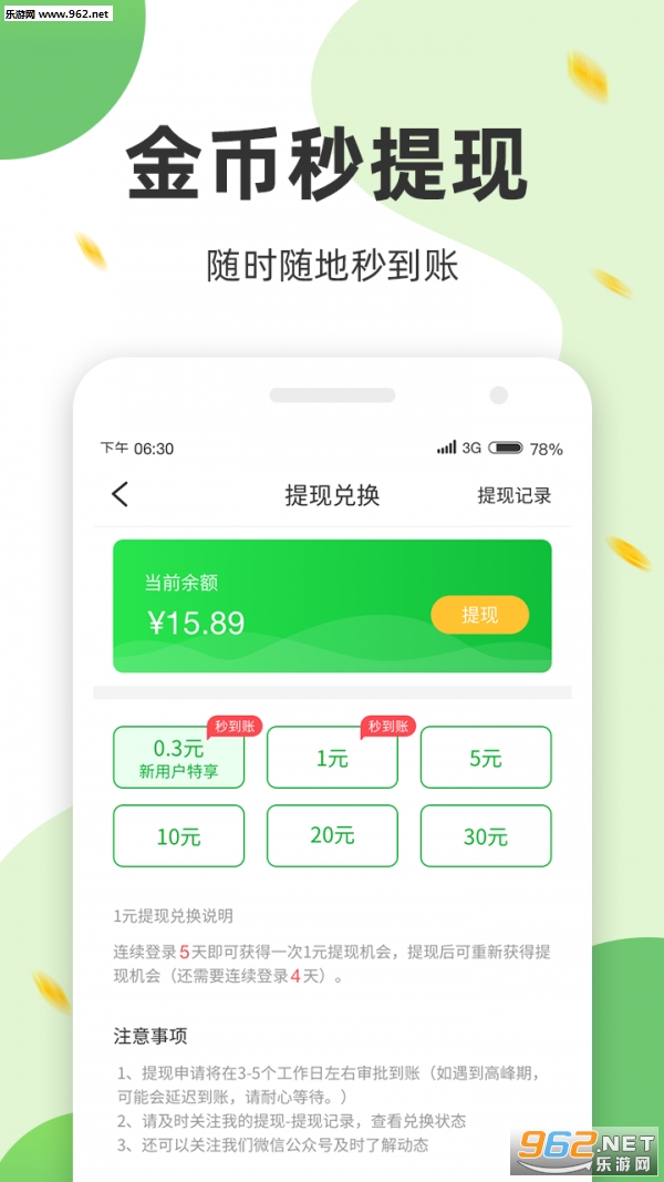 2、提现的门槛特别低,只要赚到足够的钱就能够随时提现,使用更加顺心;