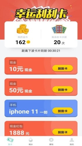 全民呱呱App是一个趣味刮刮卡玩法的手机软件,用户通过完成任务可以赚金币,用金币来购买刮刮卡,可以刮出各种好礼,最高可以刮出1888元现金红包哦!