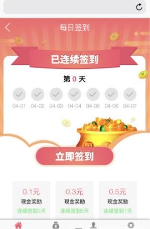2、连续签到3天奖励0.1元,签到5天0.3元,签到7天0.5元