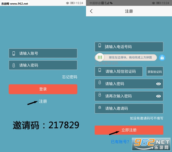 2、打开APP进行注册,注册完成后返回登录,邀请码请填写:217829