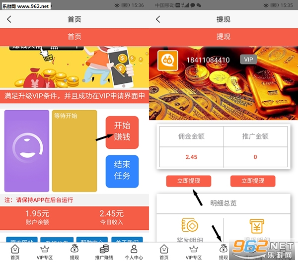 3、登陆后点击在【首页】点击【开始赚钱】,软件会自动运行,等账户金额超过0.5元之后【结束任务】,点击底部【提现】按钮输入支付宝信息然后提现即可