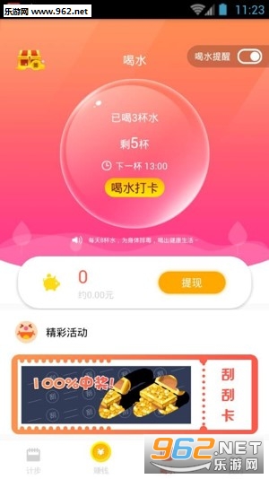 爱计步根据8杯水科学理论基础,每天定时提醒您喝水。每喝一杯水,即可获得金币奖励。每天8杯水,健康生活喝出来。