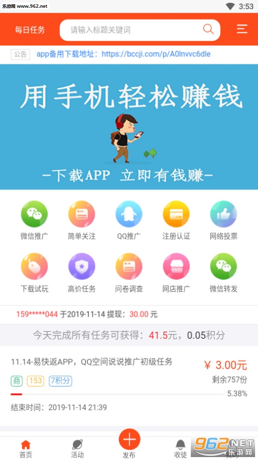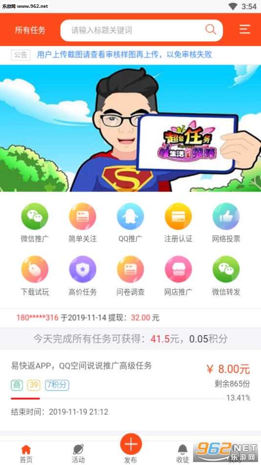 非常正规nice的一款全新网赚平台,用手机做任务赚钱,在这里平台每天都会有大量的东西需要推广,用户们只需领取任务完成即可获得丰厚的奖励,是一款非常不错的网赚软件哦。