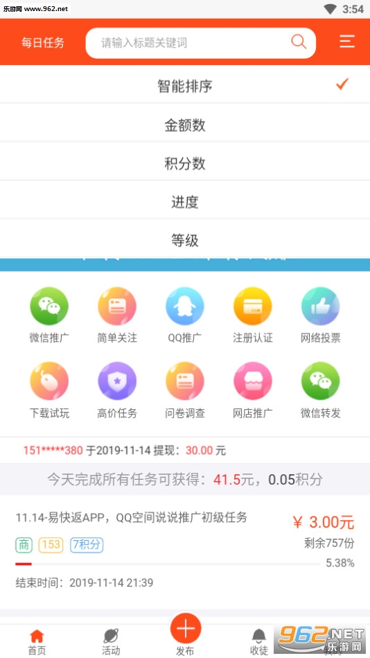 3、推广奖励:好友做任务返利25%好友提现5块的0.5元,提现支付宝30元起步,无手续费,2个小时到账!