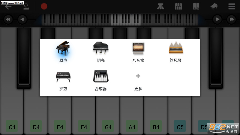 支持5种键盘音效: 钢琴, 八音盒, 风琴, 电子琴, 音乐合成器
