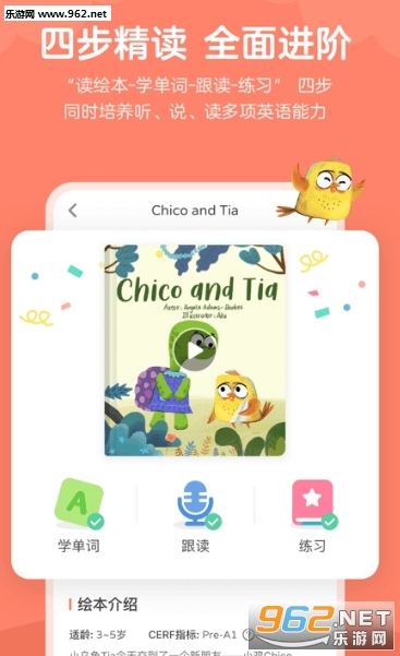 “读绘本-学单词-跟读-练习” 四步精读绘本,同时培养听、说、读多项英语能力。