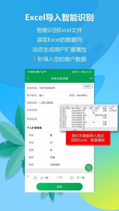 支持按键输入、复制黏贴、拍照取号、Excel或文本文件导入,智能识别Excel,动态生成客户属性