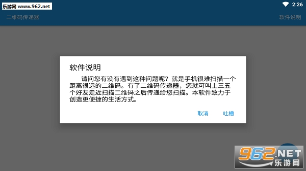 就是手机很难扫描一个距离很远的二维码。有了二维码传递器,您就可叫上三五个好友走近扫描二维码之后传递给您扫描。本软件致力于创造更便捷的生活方式。